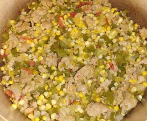Cajun-style mirepoix (red, yellow, and green bell peppers, onion, celery, serrano), corn, and hot chicken sausage, smoked paprika, cayenne, salt and black pepper, chicken stock, bit of butter. No complaints!